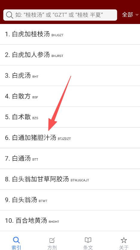 1、打开软件,搜索方剂名称(如白通加猪胆汁汤),进入方剂列表页。