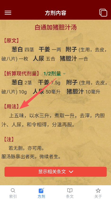 2、点击方剂,查看原文、折算现代剂量、用法等内容。