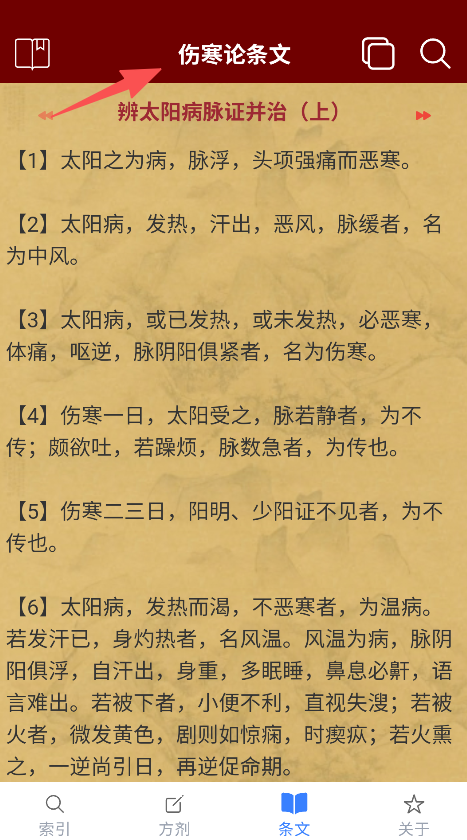 3、切换至条文板块,阅读伤寒论条文,学习中医理论。