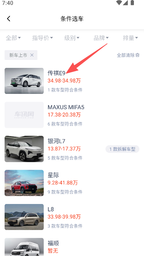 2、拥有车型筛选功能,支持按指导价、级别等条件选车,快速定位目标车型,提升选车效率。