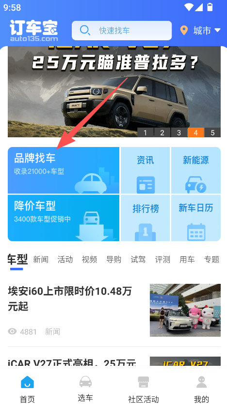 1、打开软件,选择品牌找车,进入车型选择页。