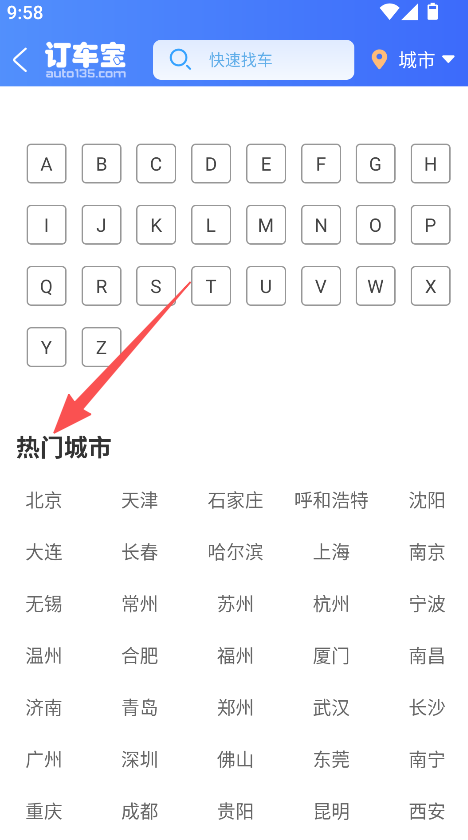 2、拥有城市选择功能,可选择热门城市,精准定位购车区域,提升选车针对性。