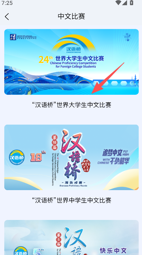 2、选择赛事(如汉语桥世界大学生中文比赛),进入详情页。