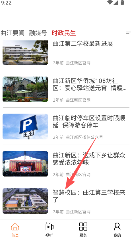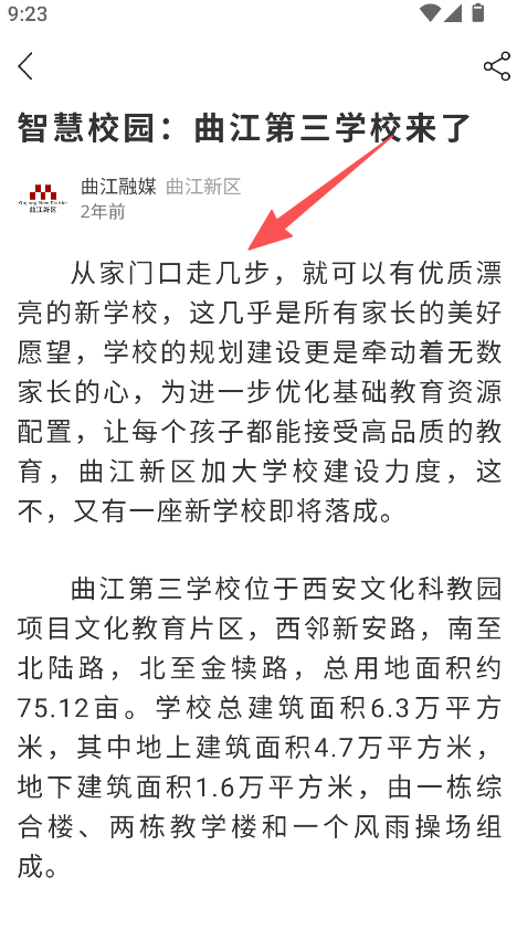 2、选择新闻(如智慧校园:曲江第三学校来了),进入新闻详情页。