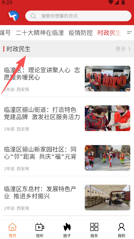 1、打开软件,选择时政民生板块,进入新闻列表。