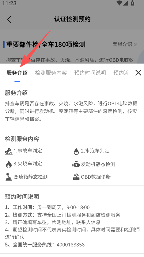 3、查看检测服务细节,预约检测时间,享受二手车检测服务。