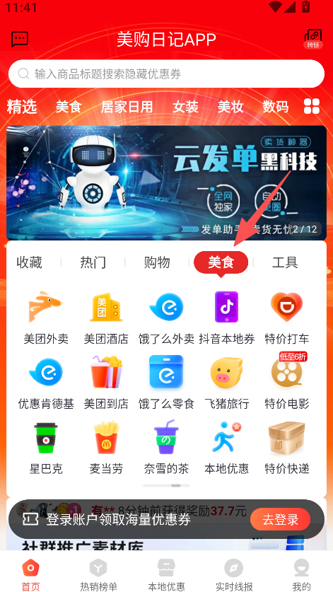 2、设有美食、购物等板块入口,点击进入可领取对应外卖红包、商品优惠券,便捷享受优惠。