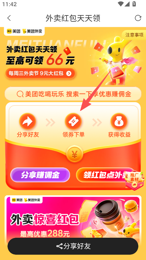 2、进入美食板块,点外卖红包入口领至高66元红包并领券下单。