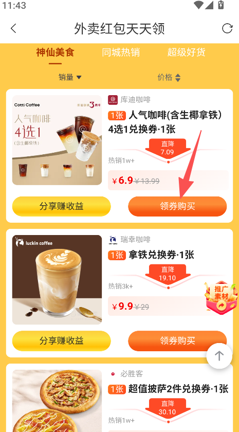 3、选中心仪商品或服务,点击领券购买,还可分享赚收益。