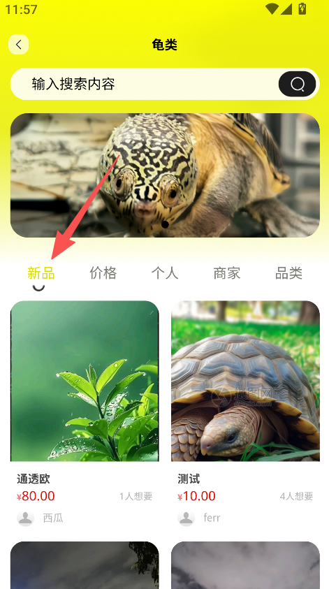 2、龟类商品展示有新品、价格、个人、商家、品类等分类,方便快速找到心仪龟类。