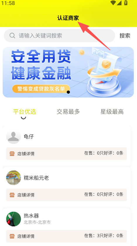 3、返回首页点击认证商家,可查看平台甄选的商家信息,了解店铺在售及好评情况。
