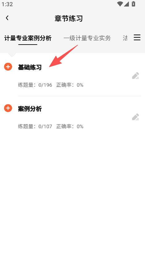 2、进入章节练习后,选择基础练习或案例分析分类。