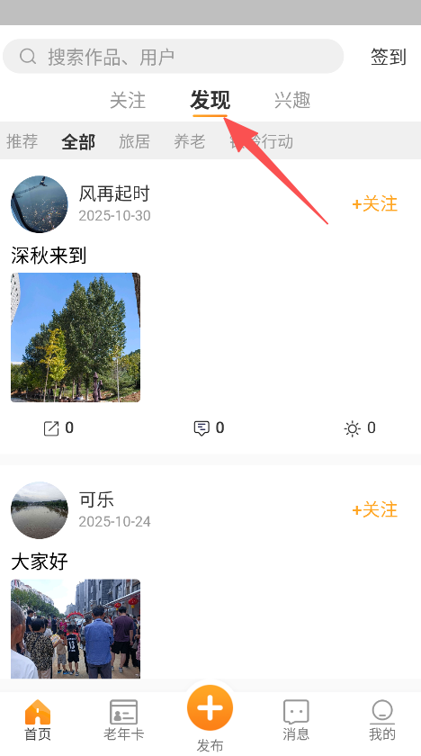 2、板块设计清晰,发现板块下分旅居、养老、银龄行动等分类,内容浏览路径明确,操作友好易上手。