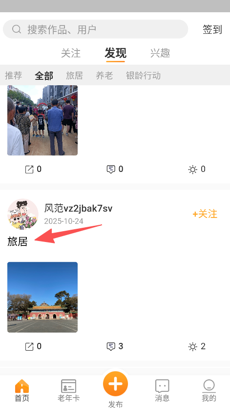 1、具备内容分类浏览功能,发现板块下多分类布局,用户可按旅居、养老等分类浏览内容,查找高效。