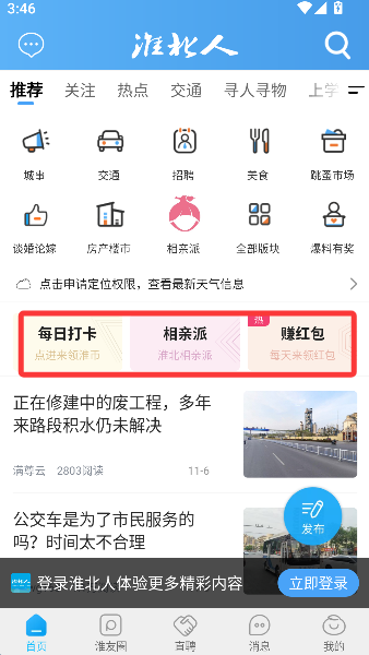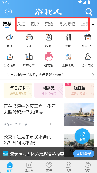 1、首页顶部汇聚了关注、热点、交通、寻人寻物等板块,如同一个实时滚动的城市信息万花筒。