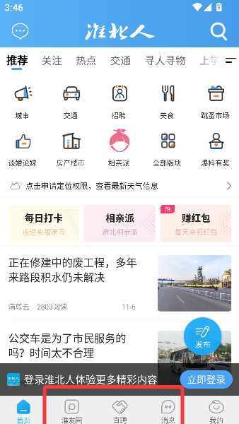 3、首页底部稳坐着淮友圈、直聘、消息三大板块,构成了连接本地生活与机遇的坚实三角。