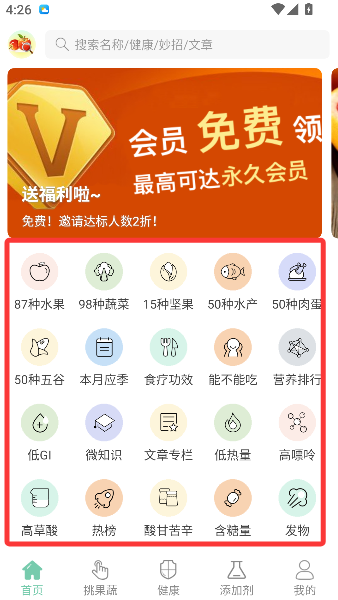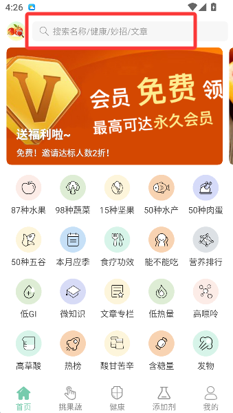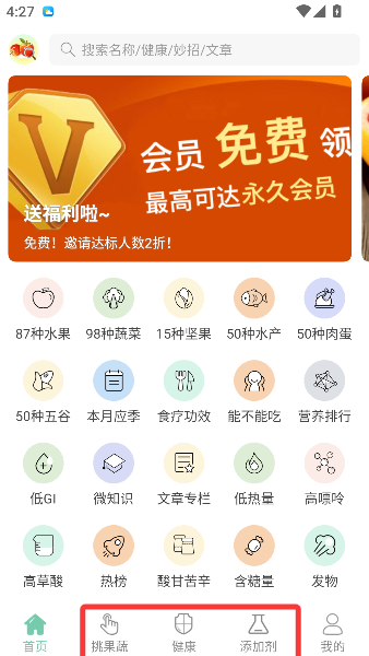 3、首页底部整齐排列着“挑果蔬”、“健康”、“添加剂”板块,构成一套完整的饮食生活宝典。