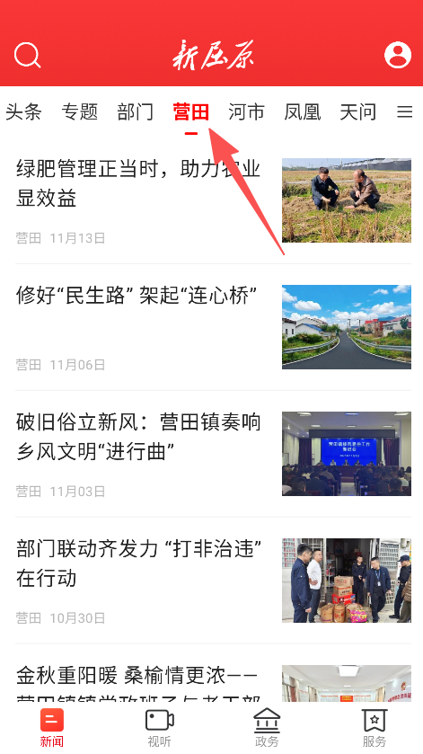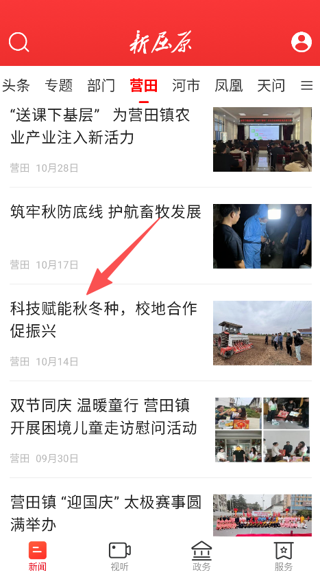 1、打开软件,在新闻板块选择乡镇如营田,浏览本地新闻。