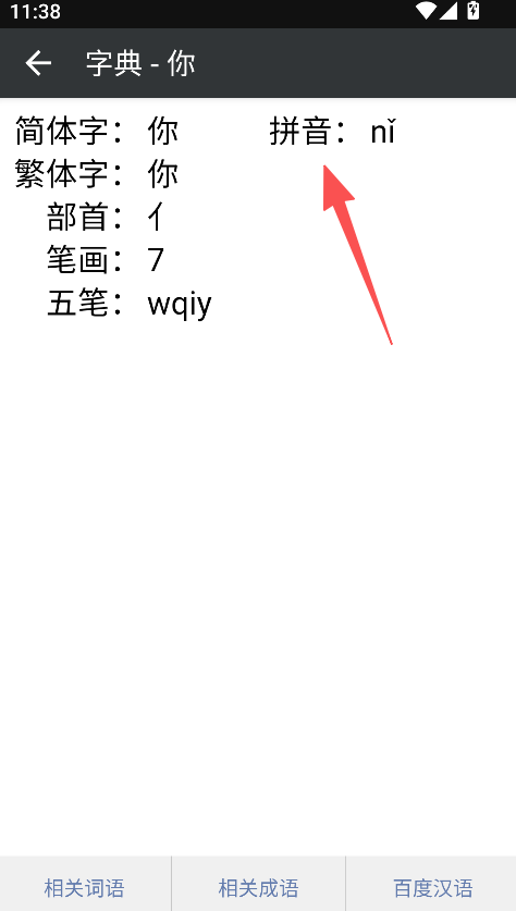 2、在搜索栏输入汉字,如你,即可查看拼音、部首等信息。