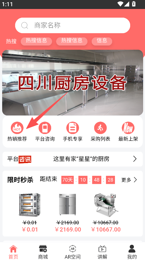 1、打开软件,点击热销推荐或限时秒杀,浏览商用厨房设备。
