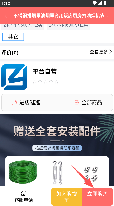 3、品质保障突出,平台自营商品多,如不锈钢排烟罩等设备,附带安装配件,保障设备采购的品质与售后。