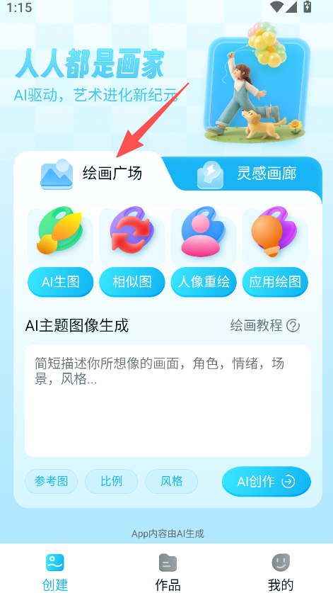 1、创作模式多元,以AI驱动为核心,提供AI生图、相似图、应用绘图等工具,覆盖多种艺术创作场景,让用户能尝试不同形式的绘画创作。
