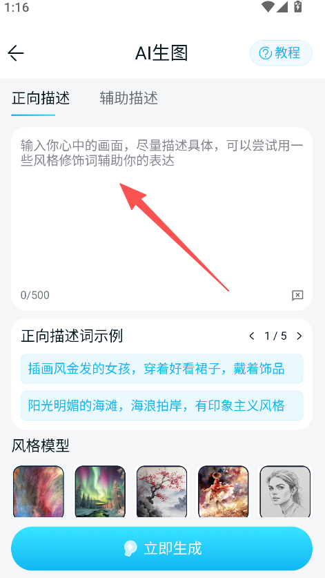 3、创作辅助全面,在AI生图中提供风格模型示例、描述词示例,还有绘画教程,帮助用户清晰掌握创作方法,提升创作体验。