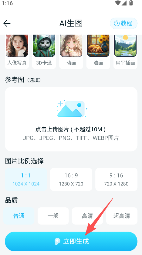 2、选择风格模型、图片比例和品质,可上传参考图。