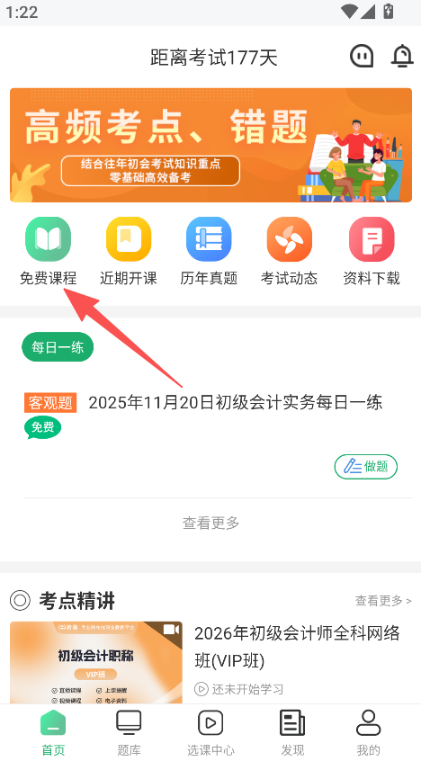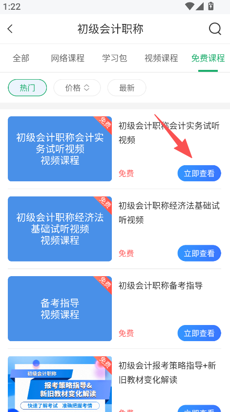 1、打开软件,点击免费课程,选择初级会计试听视频立即查看。