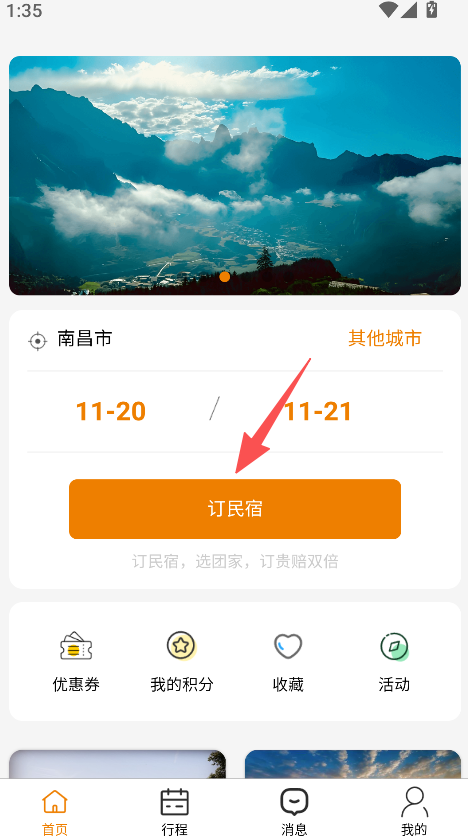 3、功能模块清晰,设置优惠券、积分、收藏、活动板块,用户可享受优惠、积累积分,优化民宿预订体验。