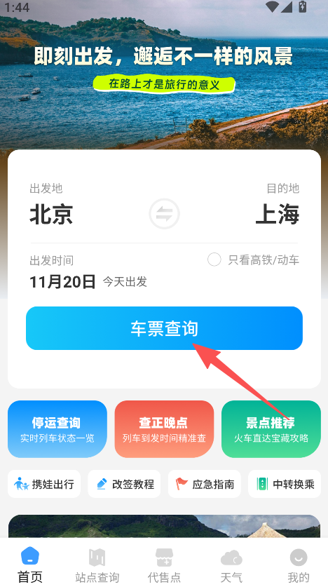 1、打开软件,选择出发地、目的地和出发时间,点击车票查询。