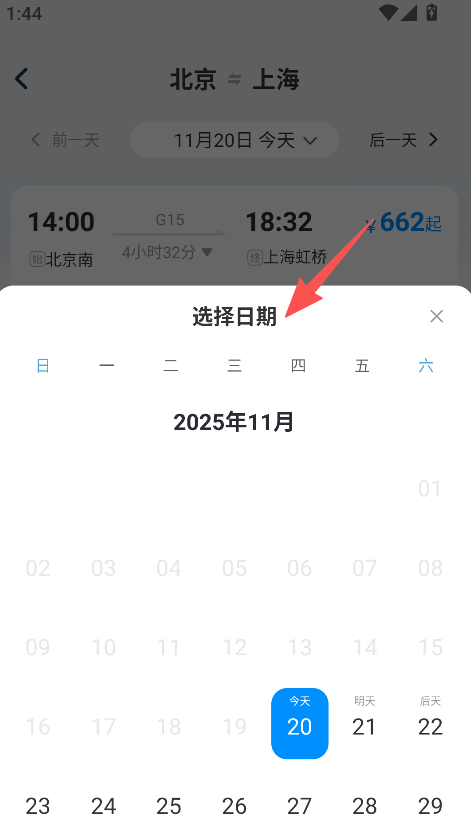 2、日期选择功能,可选择不同日期查看车次,方便用户根据行程安排选择合适出行时间。