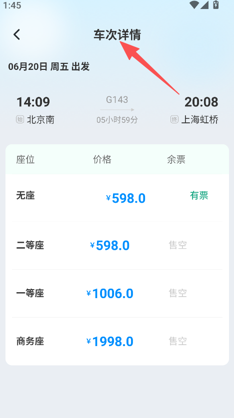 3、信息展示全面,车次详情包含座位类型、价格、余票情况,让用户清晰知晓车票资源,便于出行决策。