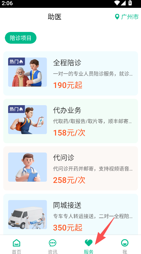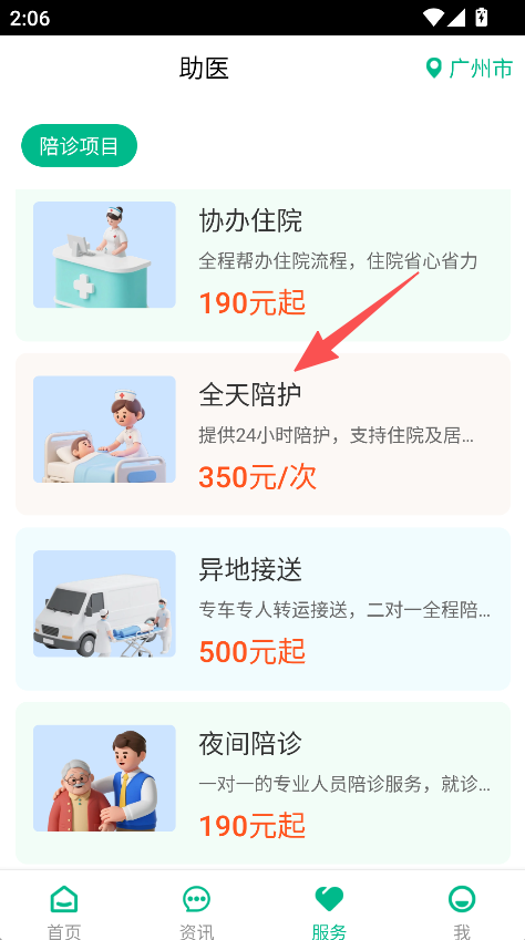 1、打开软件,点击服务,选择助医服务项目如全天陪护。