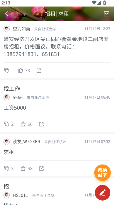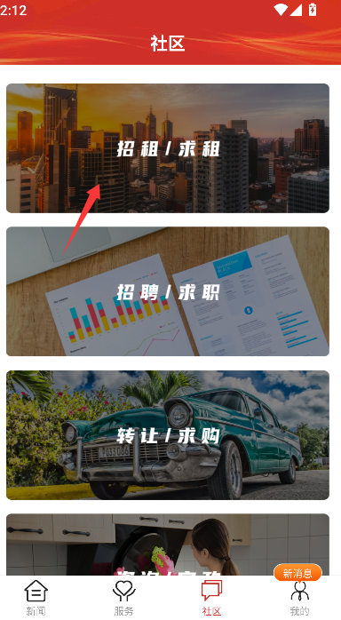 2、可见以信息公告栏形式呈现的多种生活服务条目,其中包含求租、招租等分类信息。