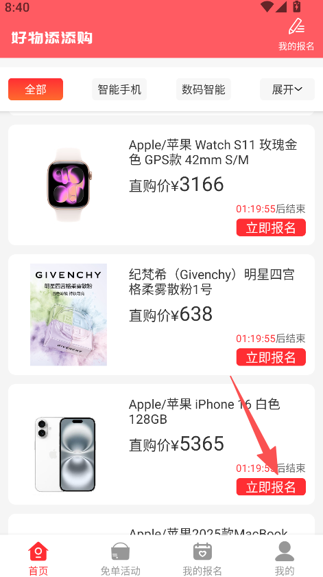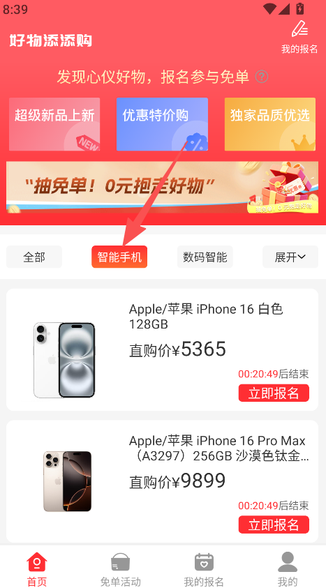 1、选择商品分类(如智能手机),点击商品立即报名。