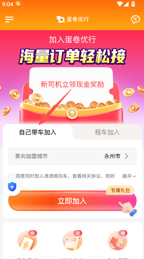 1、加盟模式多样,提供自己带车和租车两种加入方式,适配不同司机加盟需求,让司机可灵活选择,加盟路径多元。