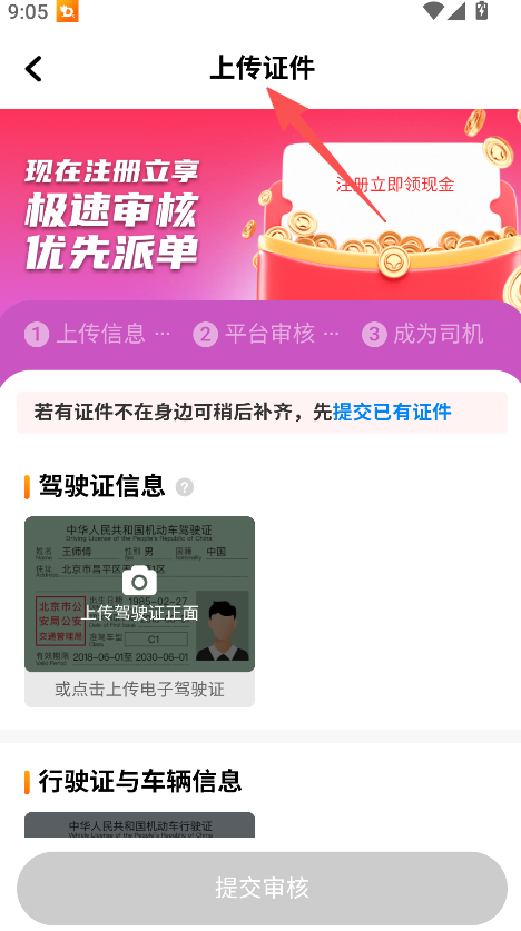 3、证件上传功能,支持上传驾驶证等证件,完成加盟审核信息提交,助力司机通过审核成为平台司机,开展接单。