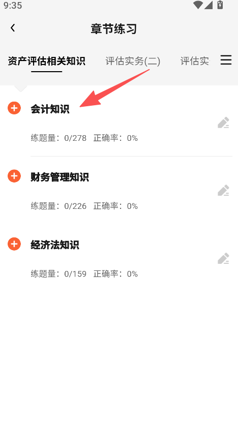 1、章节练习功能,考生可选择会计、财务管理等科目,按章节进行系统性练习,夯实资产评估考试知识基础。