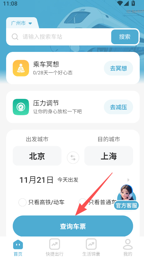 1、功能板块多元,既有火车票查询核心功能,又有乘车冥想、压力调节附加服务,覆盖出行规划与心理舒缓场景,服务维度丰富。