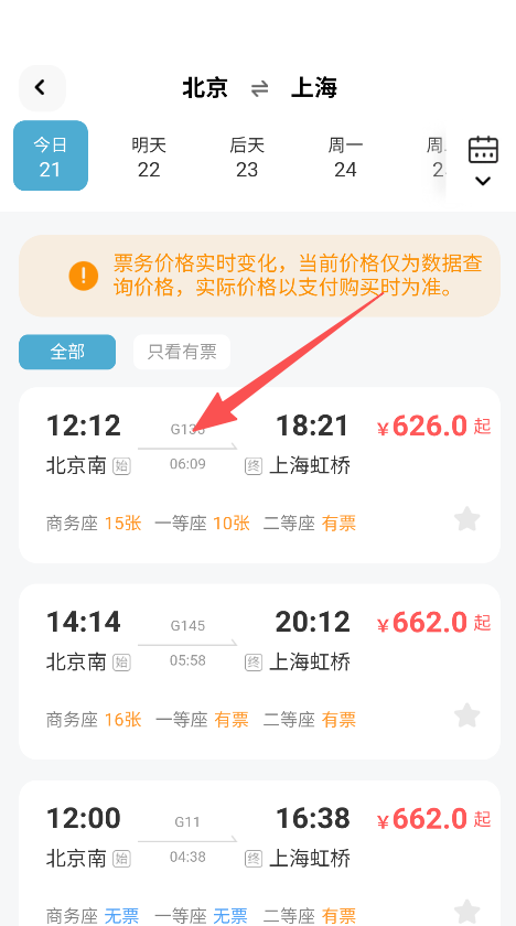 3、选择心仪车次,查看票价与余票信息,完成车票查询。