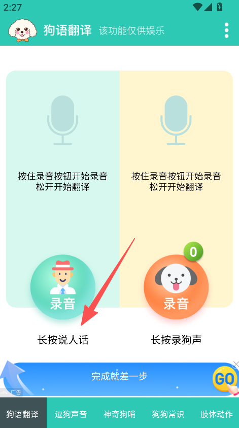 1、打开软件,进入狗语翻译板块,长按录音按钮录人话,松开开始翻译。