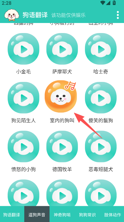 3、选择不同的狗声选项,如室内的狗叫,播放音效与宠物互动。