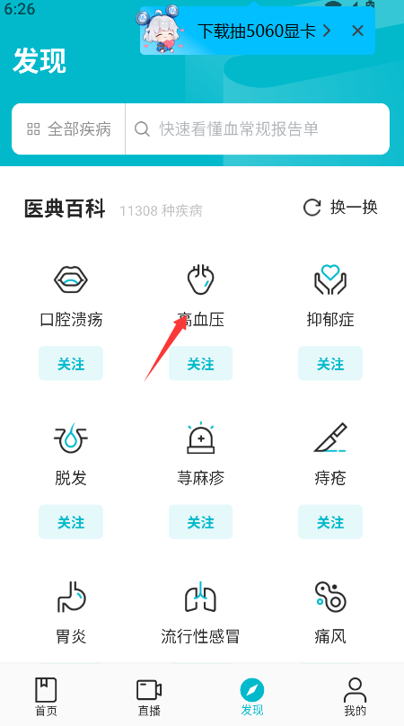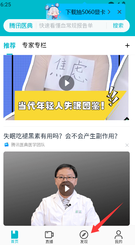 1、点击“发现”选项,页面将跳转至医疗资讯发现中心。
