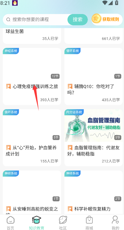 1、找到并点击"知识教育"功能入口,页面将跳转至知识教育主页面。