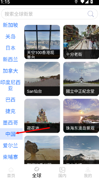 2、在全球景点界面的地区分类中选择 “中国”,即可查看国内各地著名景点的位置、简介等信息。