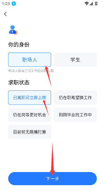 2、接着在身份和工作状态的选项里做出选择,感觉就像在扮演人生角色扮演游戏,不同的选择将开启不同的职业副本。