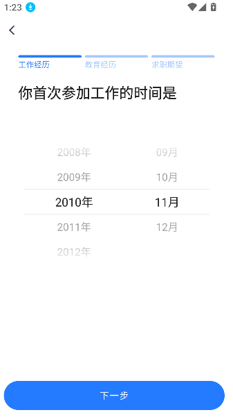 3、最后需要选择首次参加工作的年份,软件会贴心地列出时间轴,仿佛在帮你回顾那段青涩又充满干劲的职场开端。