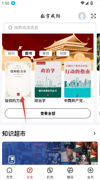 2、接着在琳琅满目的文化栏目中精准选中“图书”选项,就像站在智慧图书馆前挑选心仪的知识殿堂。