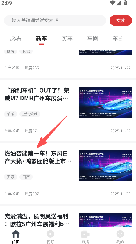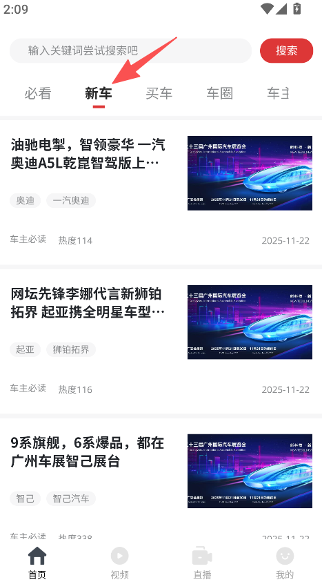 1、打开软件,点击新车板块,浏览最新车型资讯列表。